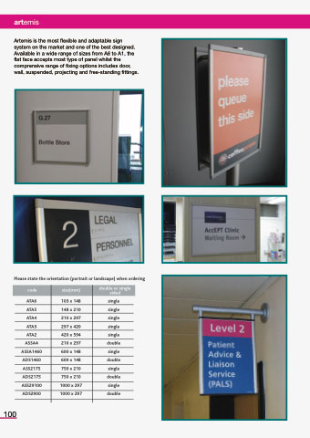 Artemis is the most flexible and adaptable sign system on the market and one of the best designed. Available in a wide range of sizes from A6 to A1, the flat face accepts most type of panel whilst the comprensive range of fixing options includes door, wall, suspended, projecting and free-standing fittings.