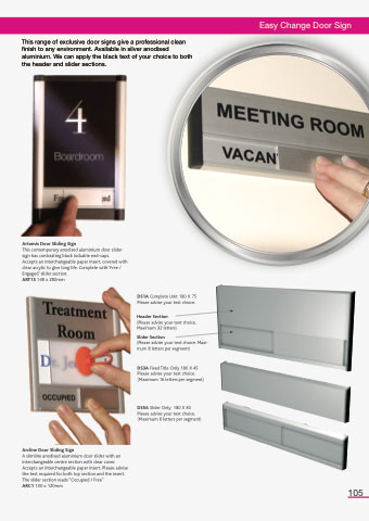 This range of exclusive door signs give a professional clean finish to any environment. Available in silver anodised aluminium. We can apply the black text of your choice to both the header and slider sections.