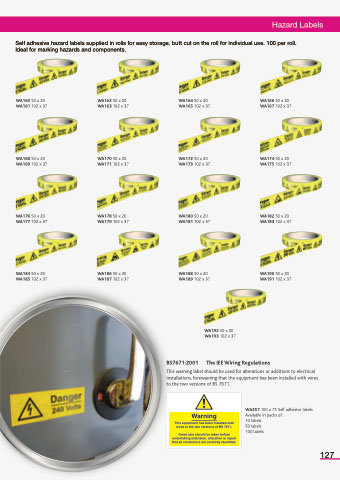 Self adhesive hazard labels supplied in rolls for easy storage, butt cut on the roll for individual use. 100 per roll. Ideal for marking hazards and components.