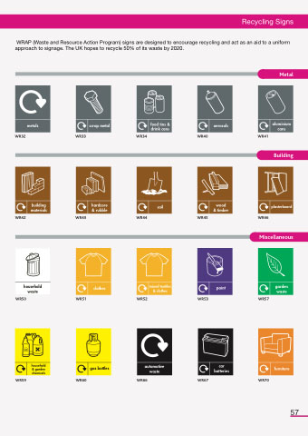 WRAP (Waste and Resource Action Program) signs are designed to encourage recycling and act as an aid to a uniform approach to signage. The UK hopes to recycle 50% of its waste by 2020.