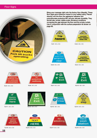 Bring your message right onto the factory floor (literally). These floor signs give maximum impact to your safety policy. Placed directly onto the floor the aggressive adhesive and polycarbonate protective film will give ultimate durability. They should also remain visible under smokeout conditions occupying the gap between the floor and the smoke curtain. Use in conjunction with the surface preparation kit shown on page 90.
