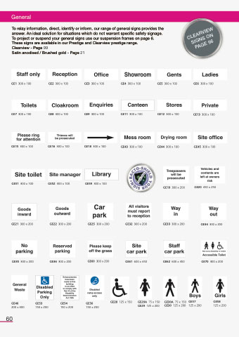 To relay information, direct, identify or inform, our range of general signs provides the answer. An ideal solution for situations which do not warrant specific safety signage. To project or suspend your general signs use our suspension frames on page 6. These signs are available in our Prestige and Clearview prestige range.